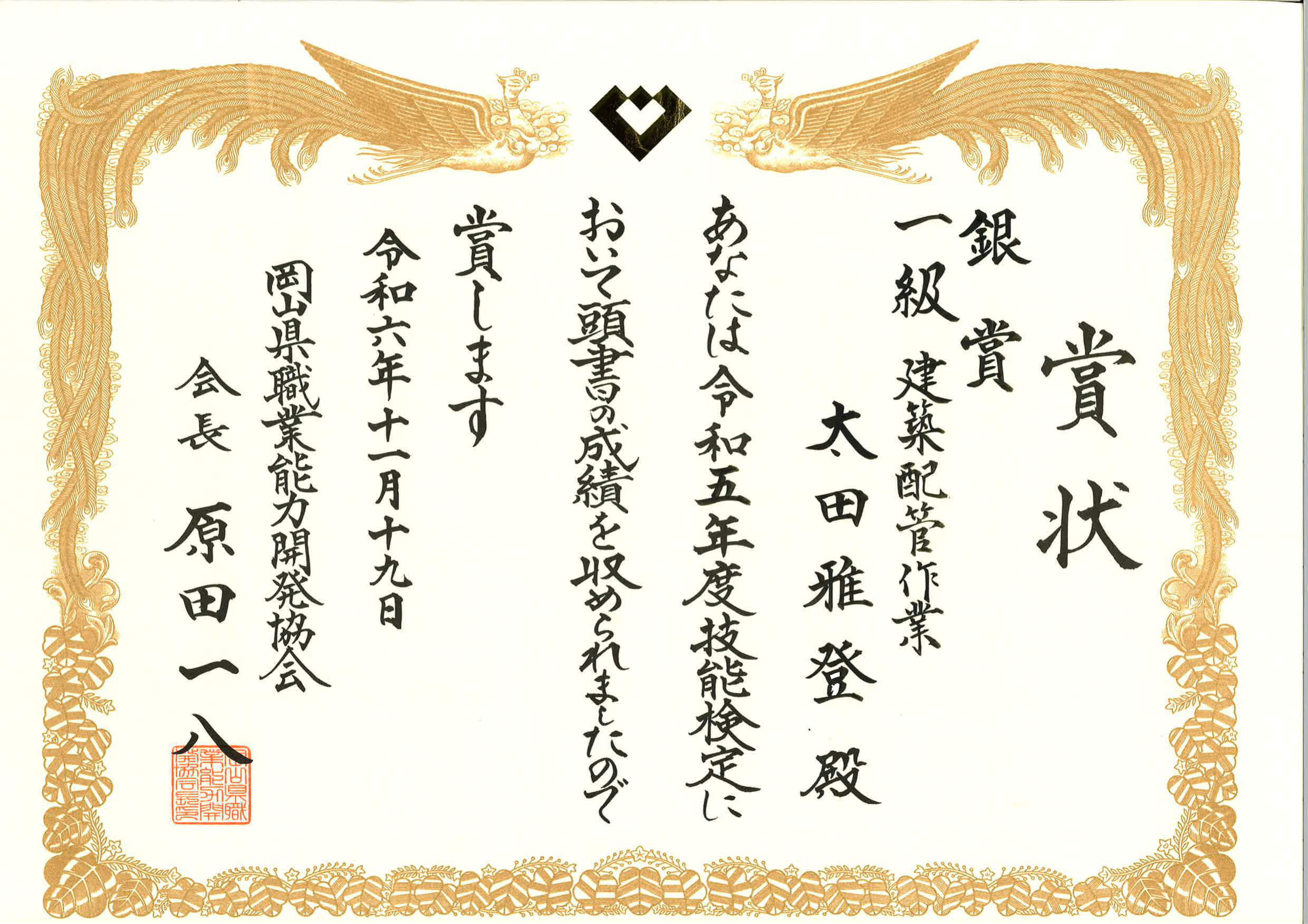 令和五年度 一級建築配管作業 太田 雅登くんが銀賞受賞致しました。