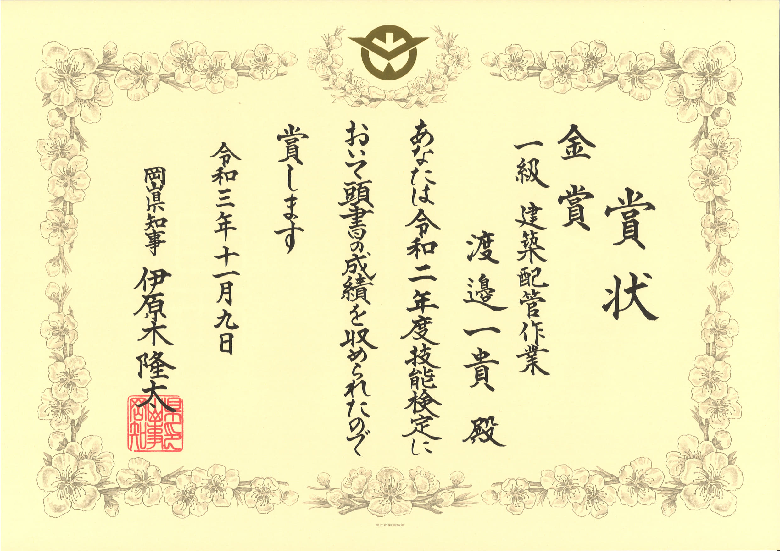 令和二年度 一級建築配管作業 渡邊 一貴くんが金賞受賞致しました。
