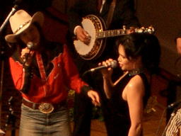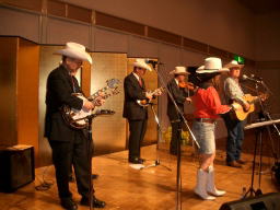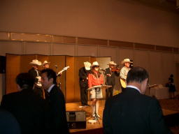 当日の宴会マネージャー、実は彼 京都産業大学OBのO崎さんでして、 バリバリのBLUEGRASSERです! 「ビルモンローか、サムブッシュ弾いてね!」 な・なんちゅうことを・・・!! |