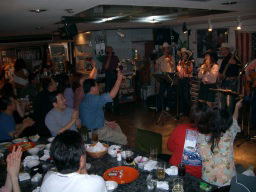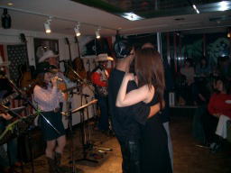 この店の特徴は横に長いのです! 7名全員横並び!そしてお客様の 正面での演奏、ちょいと緊張してます |