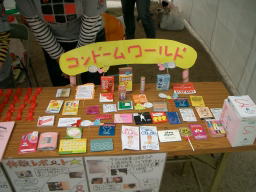 で、当日は岡山市・倉敷市保健課より 保健士の方々が啓発活動に大忙しです! また、川崎福祉大学・倉敷芸術大学の 学生さん達も、多く参加してくれました。 ↓こ、こんなにたくさんの種類のコンドーム があるんだ!! また、男性用と女性用のコンドームも無料 配布していました。 |
