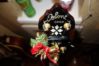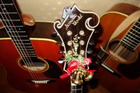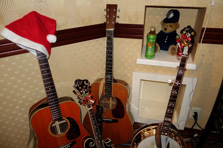 | そして、衣装を着替えてのプレゼンター役も務めてくれましたよ。 還暦をとっくに過ぎた私共も再度赤い帽子を被り演奏しました(^O^)/ 楽器にもおしゃれしていますね。 |