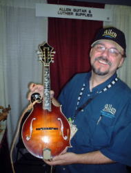 OH!MANDO界ではテールピースのALLENとして有名なオーナーです。展示していたMANDOがひどい音だったので言ってやると奥から「このMANDO弾いてみんかい!」ちゅうて出してきました。うーん隠すだけあります。友人が作ったの事。低音の立ち上りが素晴らしい!当然ですがインレイそしてテールピース、材料はすべてALLENです。 |