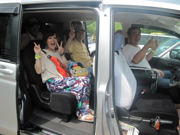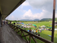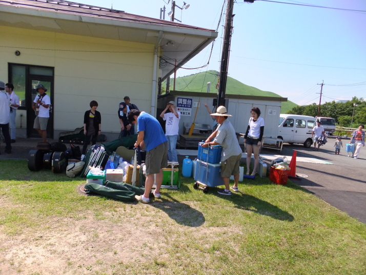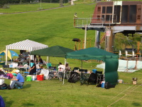 | 一年ぶりの飯田高原、スキー場をそのまま観客席にして大変に見やすくそして音も良い 私共の荷物はほとんど飲み物(焼酎!)と食料すんごい量です! そして昨年の豪雨の反省からタープを作ってもらいばっちりと夜まで美味いものを食べる準備をしました(^_^)v |