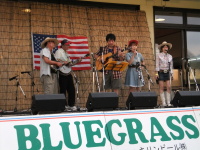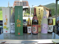 | 楽しい出演時間はあっちゅうまに過ぎ去り集合写真を撮ってもらい演奏終了!後は皆さんの演奏を聞きながらの飲み会 昨晩の門司での二日酔いもさめて仕切りなおし!ずらっと並んだ焼酎の数々!「今日は6升しかなか!」(>_<)くう〜! 焼酎横の写真は「サウスウインド」長崎ドブロ君のバンドです。ジュリアンと配置・選曲等よく似ていて楽しいですね! |