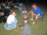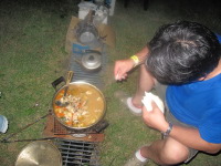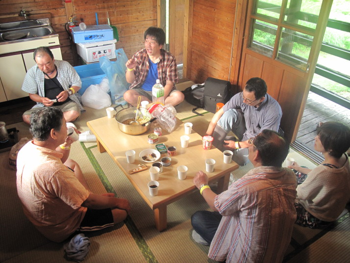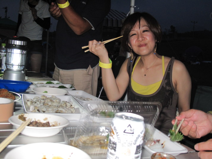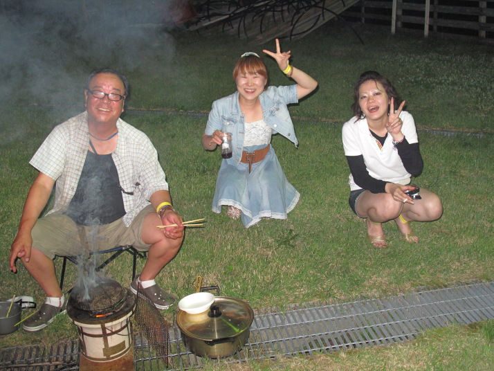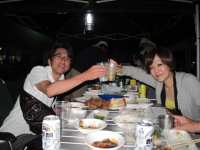| さてさて、宴会の始まり始まり!空揚げ、さしみ、焼き鳥、団子汁等々すべて手作りの力作ばかり!美味い!! Suechanが九州流の焼き鳥を披露してくれました。もうみんな酔っ払い!!飲みそして踊りだしていますね!! |
