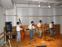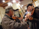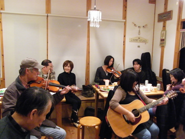 | ちゅうことで夜遅くまで飲むは騒ぐは弾くはとゆうプレイヤーにとって夢のような(?)時間でした。いつもは最初に寝てしまうVasserさんが、最後までフィドルを離しませんでした。さて、改めてロンサムドブロさんに御礼いたします。この素晴しい出会いがまた出来る事をお願いします。 {戻る} |
