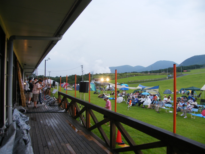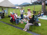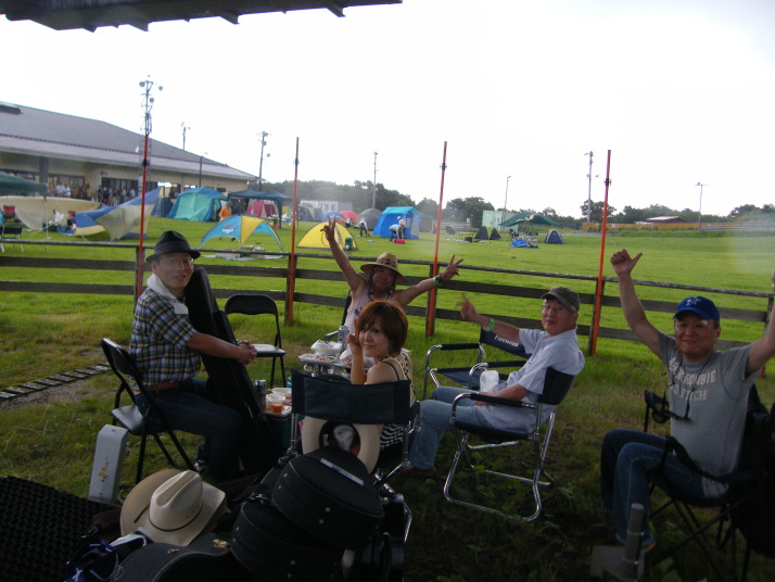 | けど小一時間後には雨も止み、無事演奏開始となりました。 | これがフェス開場の全景、スキー場天辺に向かって演奏!気持ちが良いよ | Mr,まつきちさん(?)今回大変にお世話になりました。とても美味しい食事まで用意、感激! | 出演時間が一時間延びるということは、酒の量が増えるとの事!思うようにロレツがまわらない |