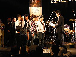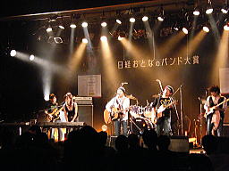 このバンドが今回No1に輝いた 「ザ・直球サプライズ」サン達です。 「明日も元気で〜わらわし伝説」 ちゅうオリジナル曲をべたべたの 大阪弁で歌いまくり大喝采でした! ホンマもんの直球勝負で受賞 |