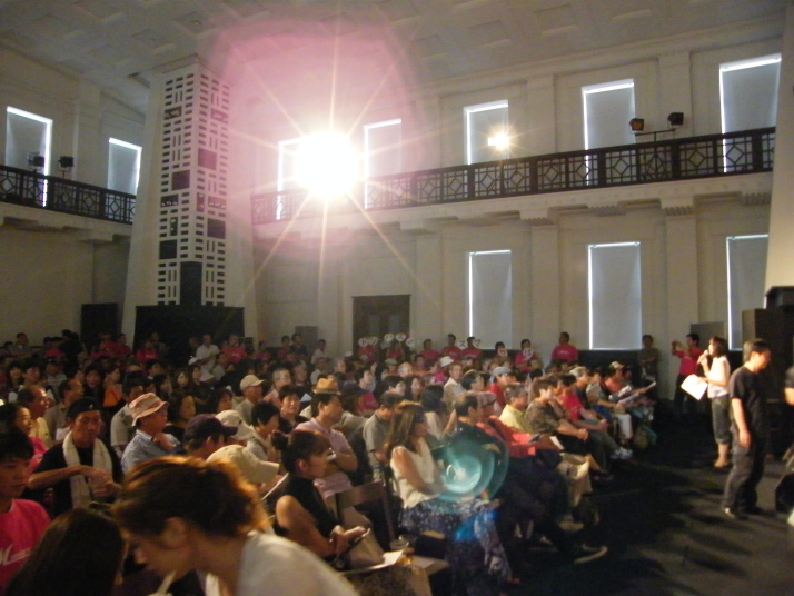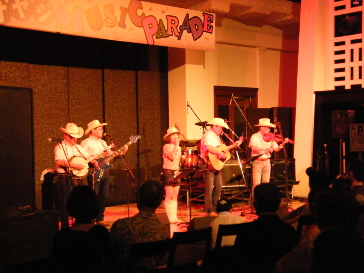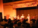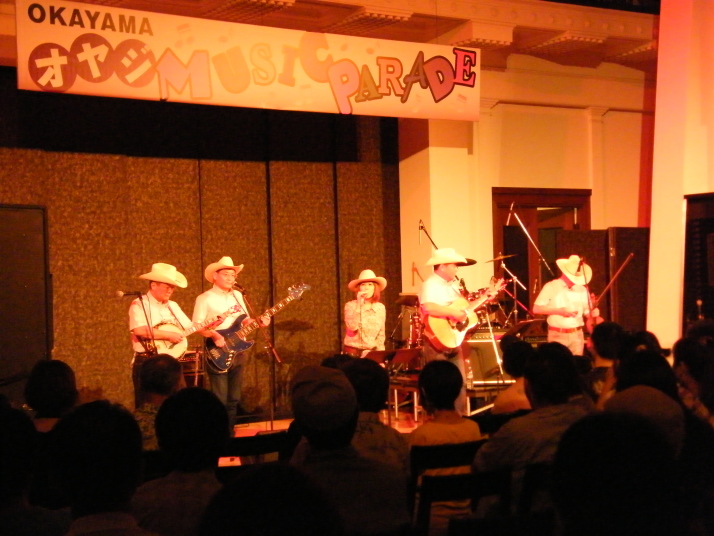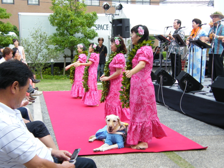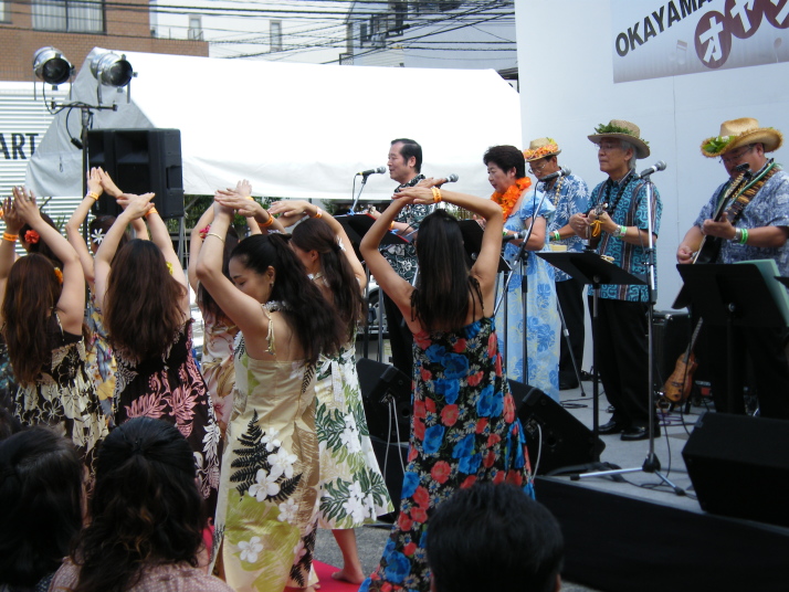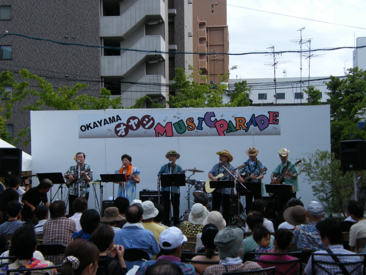 | 今年の夏はちとおかしい?梅雨からいっぺんに残暑になっちゃった!! 当日も降水確立40%というやばい状態でしたが、なんのチョー残暑!! さて、今年は27バンドというすんごいスケジュールでてんてこ舞いです。 フォークありビックバンドあり、そしてハワイアン、ロック、カントリー等々 また、ハワイアンは総勢30名近いフラの方々に踊ってもらい本当に楽しめました。 中でもピンクのフラの方は、目が不自由な方々でしたが、盲導犬を従え楽しく踊ってました。 本当に嬉しくなりました。来年も多くのバンドが出ていただけることを期待します。 私共は、昨年度優勝と言うことで今回は名誉のトリをいただき参加のみでしたとさ(^o^) {戻る} |
