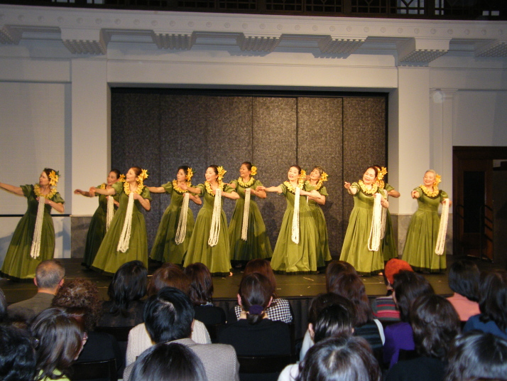 | 「ヒナファミリー」の素晴しい演奏と、なんと岡山で最も有名なフラの方々のコラボ!昨年末ハワイでの「モク・オ・ケブァ・インターナショナル・フェス」で総合2位の実力。その出演者約40名のフラは凄い迫力で思わず拍手に力が入りました。 | |||