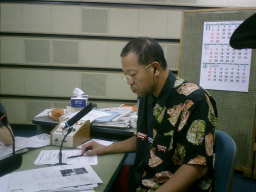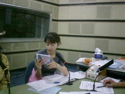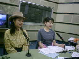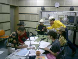 さて、ちょいと見にくいですが、スタジオ内風景 谷さん、たえちゃんを中心に6人が輪になって 入りました。熱気がムンムンですね。 |