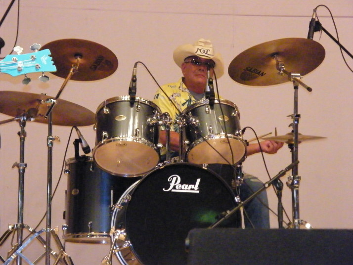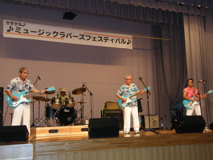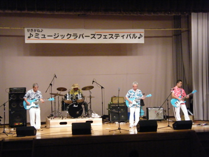 | そして、ベンチャーズバンド「MOZ’」津山からPAを大型トラックに載せきていただきました。 おそろいのギターとウエァまた、音質も最上級の演奏でした。ドラマーがカッコいいね! |