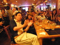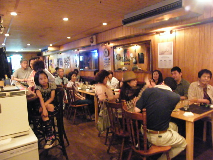 | 直前に休演のご案内をHPに書き込みましたが、本当に多くの方に御覧いただきました。 立ち見が出るくらいに超満員となり温かい応援を頂き、心より感謝申します。 右の女性達はヨットでオリンピックにも出場!また綺麗な女性陣が沢山来て楽しく飲んで頂きました。 |