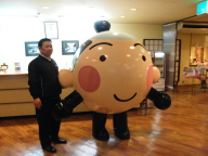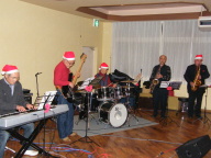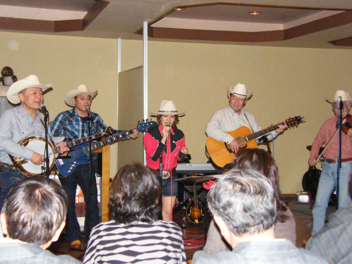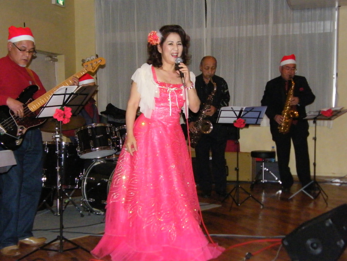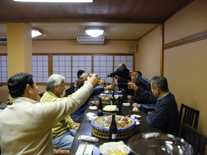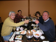 | 到着するなりいきなりの宴会モード!!本当に美味しい食事です。 | 湯原の新キャラ「温丸(あったまる)クンと社長のI田さんのご挨拶から始まりました。 | さて、まずはいつもの「スィングローズ」さんの軽快な演奏です。赤い帽子がかわゆい! | 今回特別ゲストの柳しおりさまクラウンレコード所属のプロ!湯原でお店も開いてますよ。 |