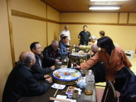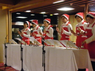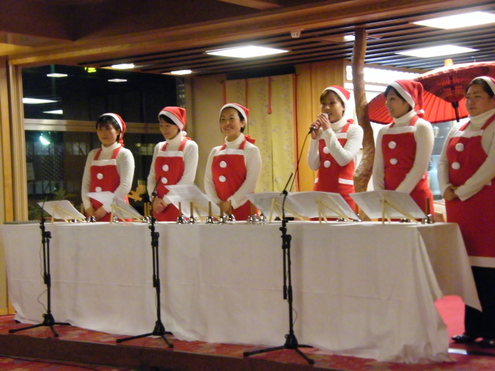 | さて、以後私共の演奏で第一部は無事終了!2部は場所を菊之湯に移動して「おかみさん会」の若女将6名によるハンドベル演奏です。よーく練習していますね!ちなみに「八景」「花やしき」「油屋」「たね屋」「湯之蔵つるや」「プチホテル湯原リゾート」です。 | |||